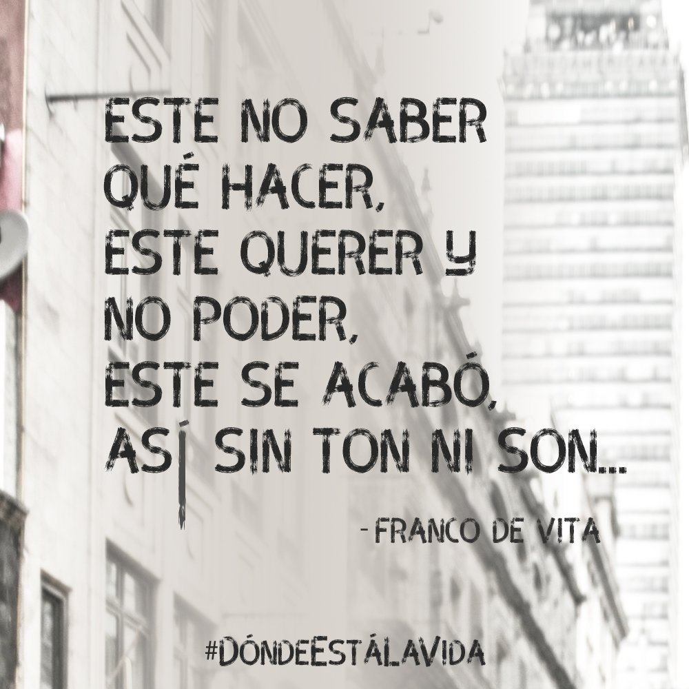 Después de siete años, el cantante y compositor venezolano Franco de Vita dará a conocer un nuevo tema musical a través de su plataformas digitales. La canción, titulada Dónde está la vida, será estrenada este viernes y representa el regreso musical de este artista. De Vita ha emprendido en sus redes una campaña en la que ha ofrecido adelantos con fotografías y fragmentos de las principales estrofas de la canción: